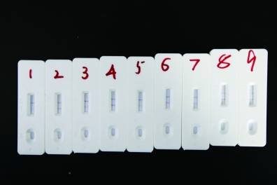 判定:位置C顯示出條帶,位置T同時出現(xiàn)條帶,表明樣品中黃曲霉毒素B1濃度低于限量。檢測卡中出現(xiàn)兩條杠說明樣品符合限量標(biāo)準(zhǔn),即符合GB2761-2011對糧油中黃曲霉毒素B1限量的規(guī)定:稻谷、糙米、大米≤10μg/kg